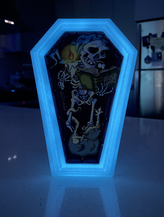 Illustrated Skeleton in a custom designed, GLOW IN THE DARK, 3D printed frame.