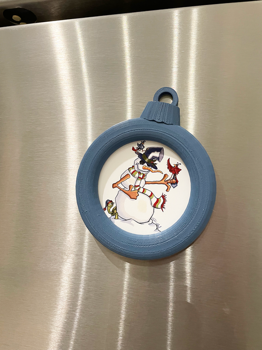 Illustrated Snowman Magnet in custom designed 3D printed frame.